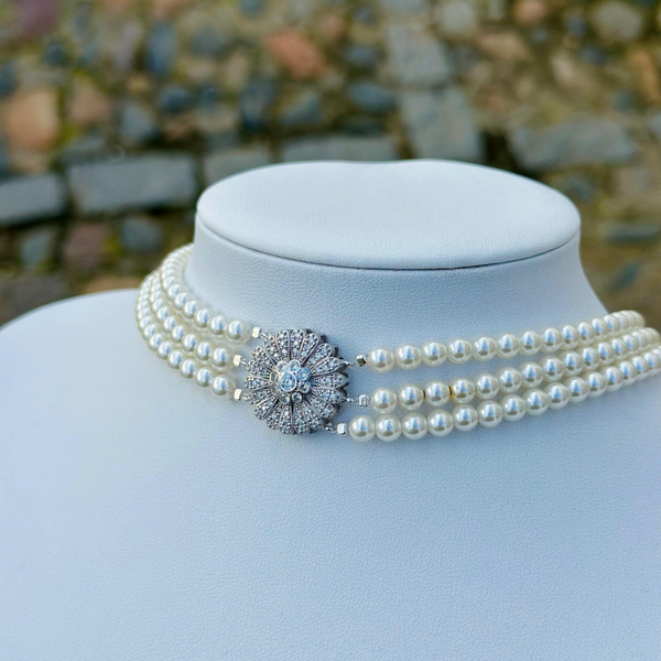 Choker de perlas natuales cultivadas, tres vuerltas con cierre de plata y broche joya
