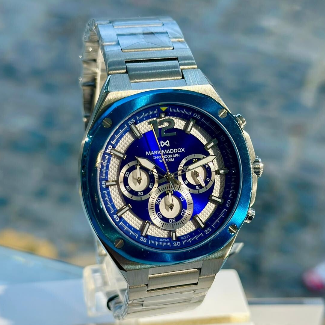 Cronógrafo para hombre con caja bitono de acero e Ip azul resistente al agua hasta 10 ATM. Su esfera bitono azul y blanca con índices aporta sofisticación y dinamismo. Destacan las agujas plateadas de horas y contadoras, junto al segundero con punta amarilla que imprime carácter y deportividad. Equipado con brazalete de acero y cristal mineral, este reloj Mark Maddox es ideal para quienes buscan precisión y estilo único.