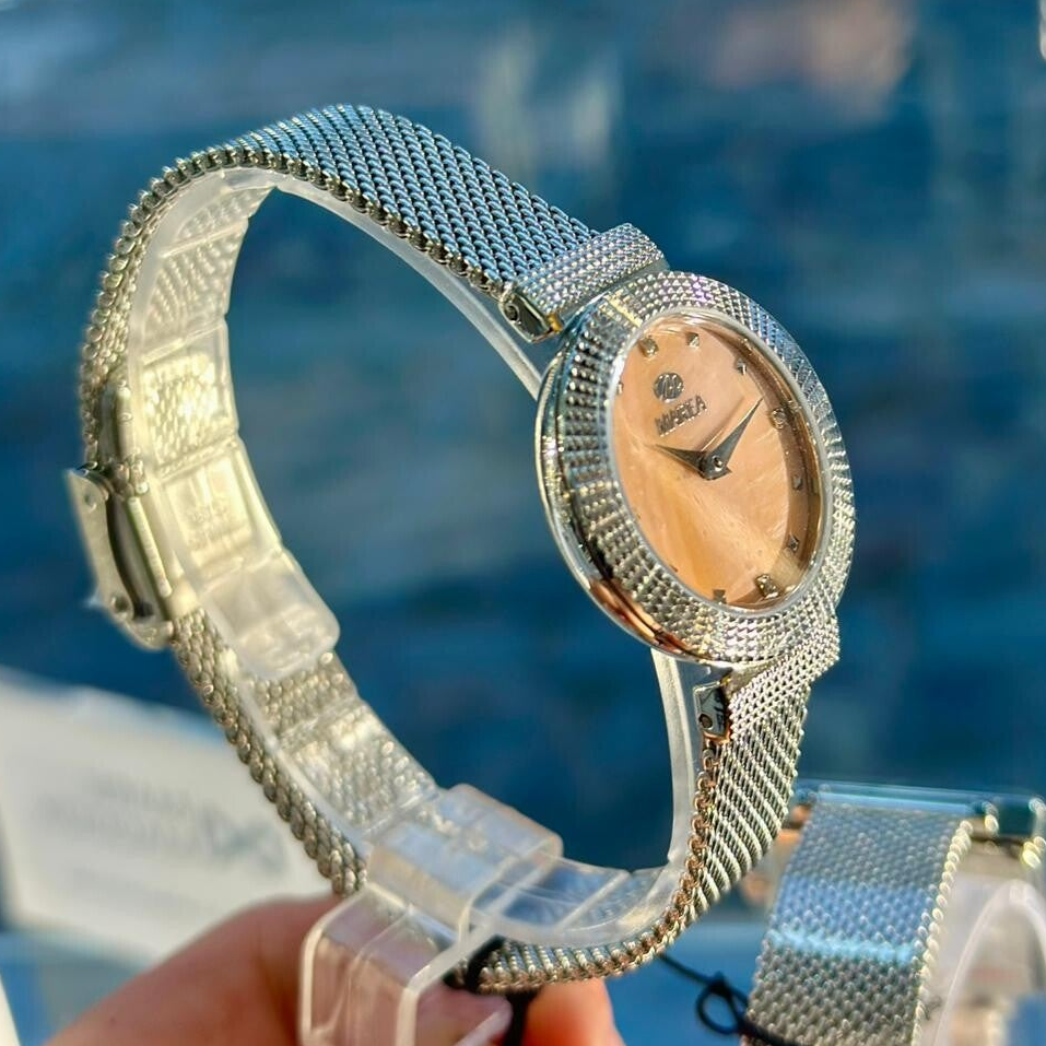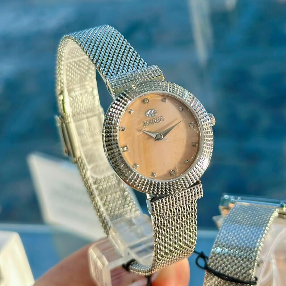 Caja de acero de 28mm de diámetro. Bisel plateado. Brazalete de malla de acero plateado. Cierre deslizante. Esfera plateada. Cristal mineral. Producto con garantía.