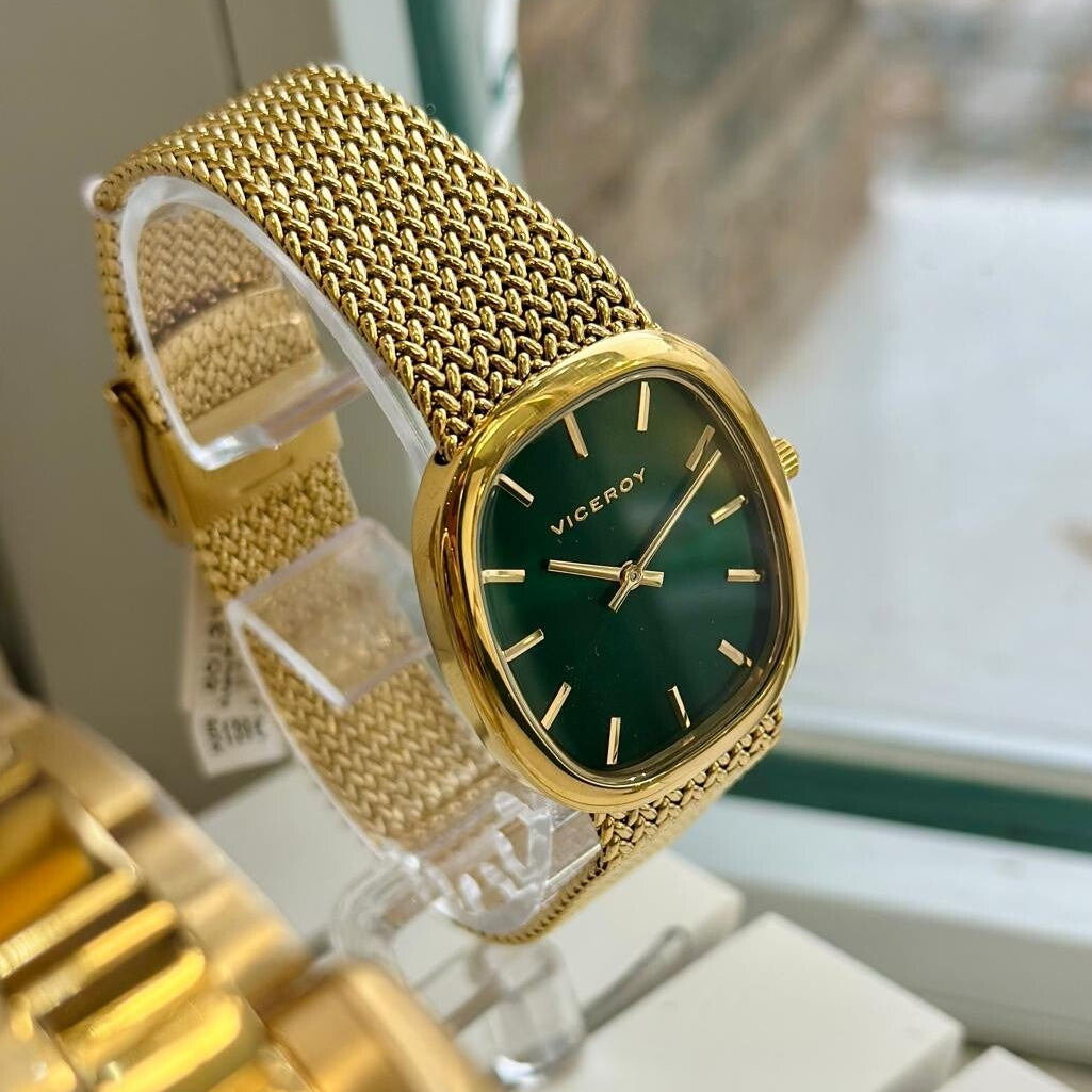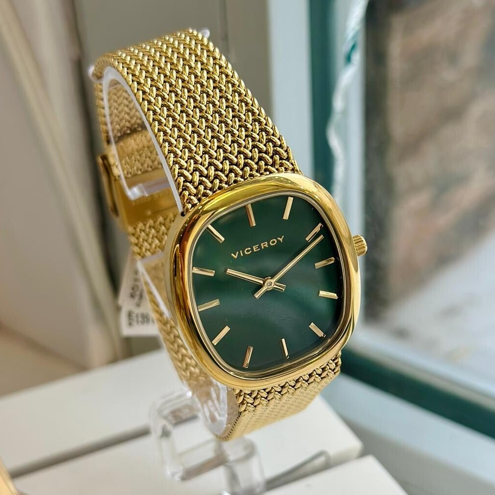 Reloj Viceroy mujer 401312-67 Reloj viceroy dorado con esfera en color verde y forma cuadradaCierre deslizante con pulsera de malla con acabado ip dorado.Caja de 31mm. Material acero