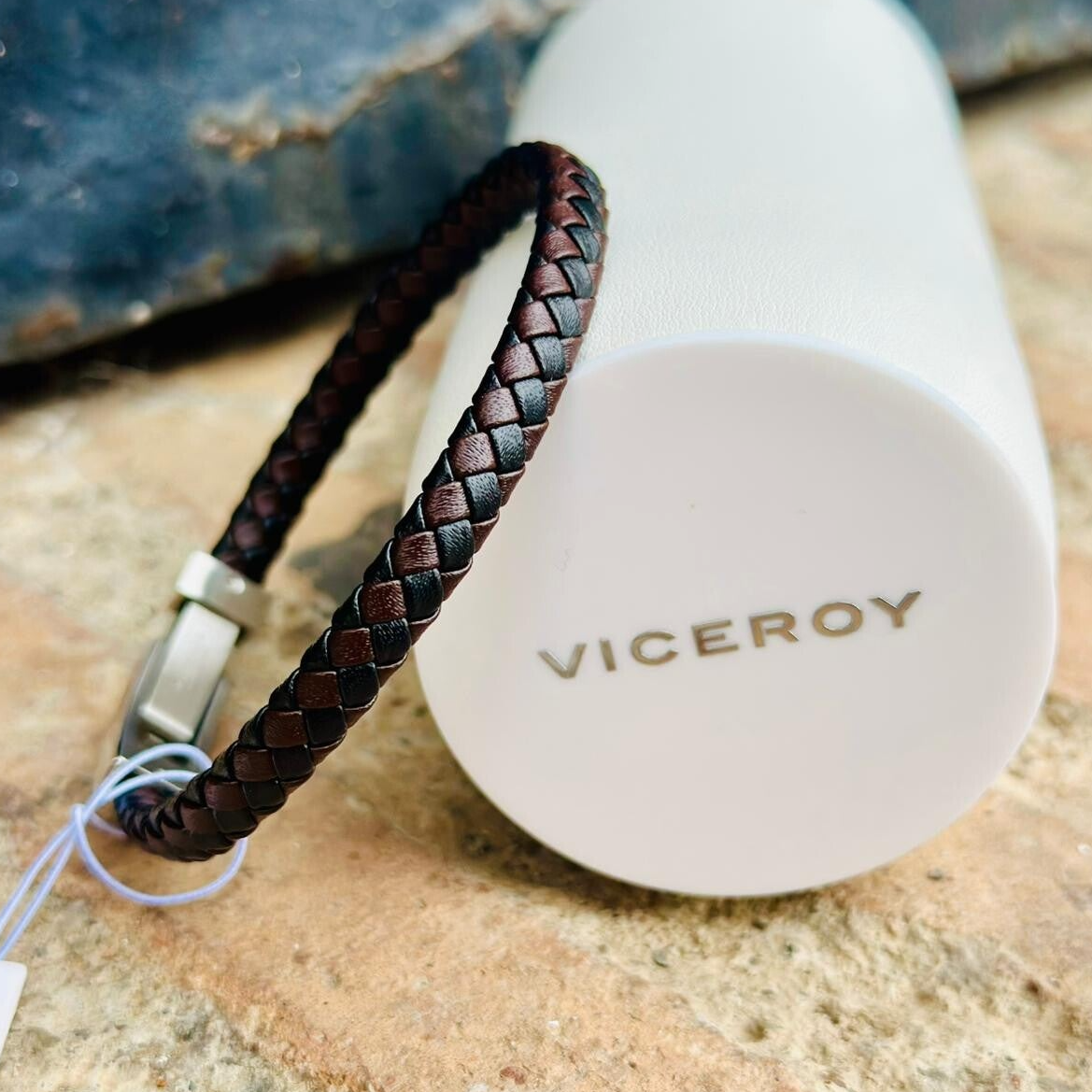 Pulsera de cuero trenzado marrón y negro.