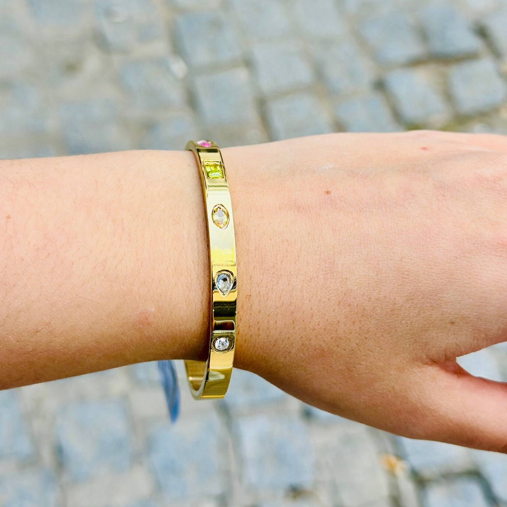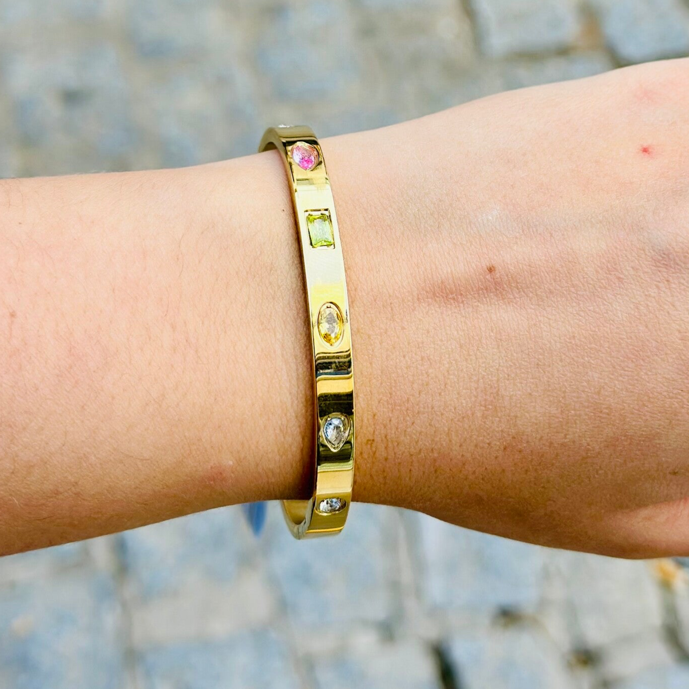 Brazalete de acero dorado con circonitas de colores