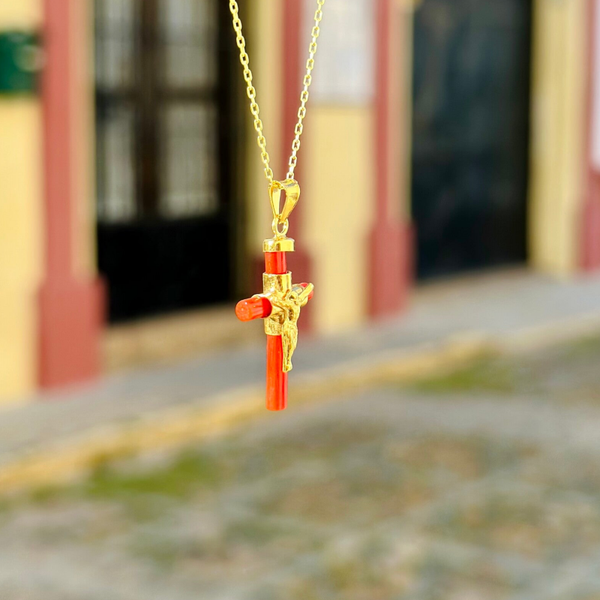 Cruz Coral con Cristo y cadena en plata chapado en oro