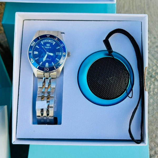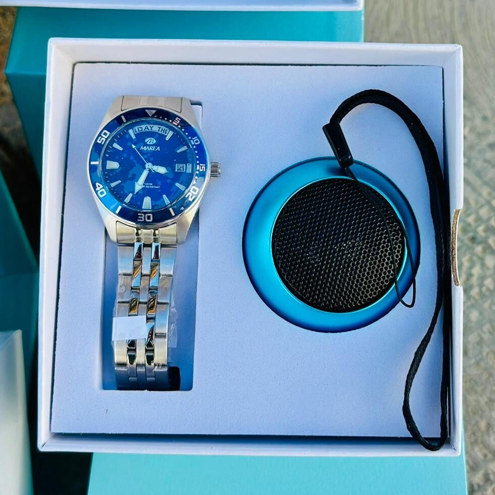 Reloj infantil analógico con brazalete de acero, esfera azul con calendario y resistencia al agua 5 ATM. Incluye altavoz Bluetooth de regalo.