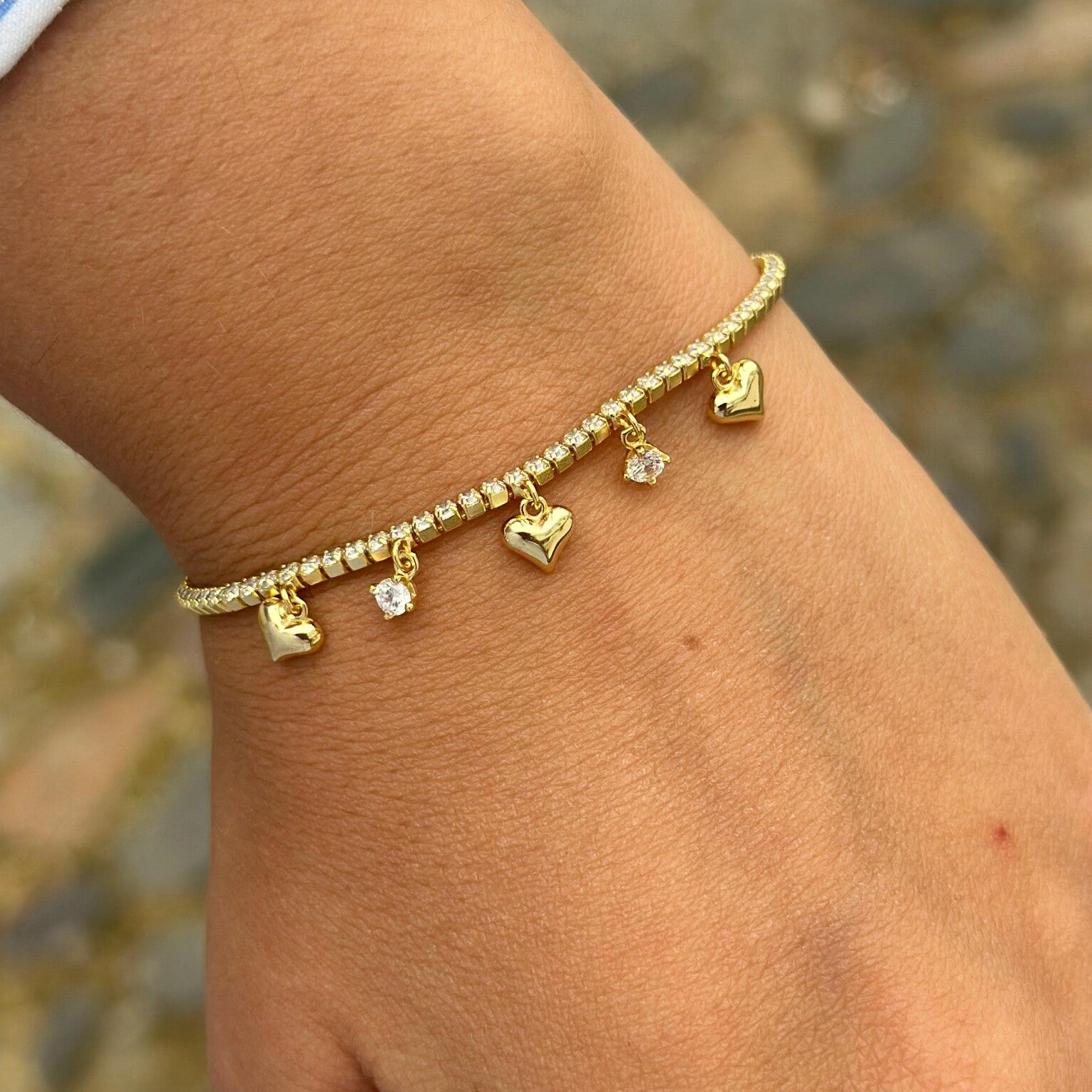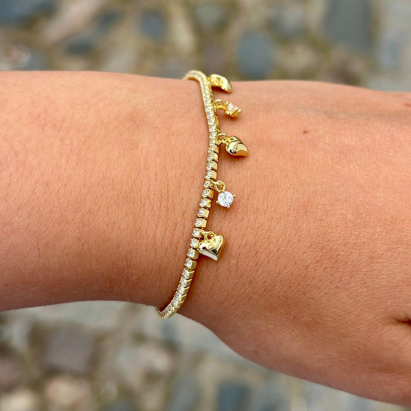 Pulsera de plata chapada en oro con circonitas y colgantes en corazón y brillo