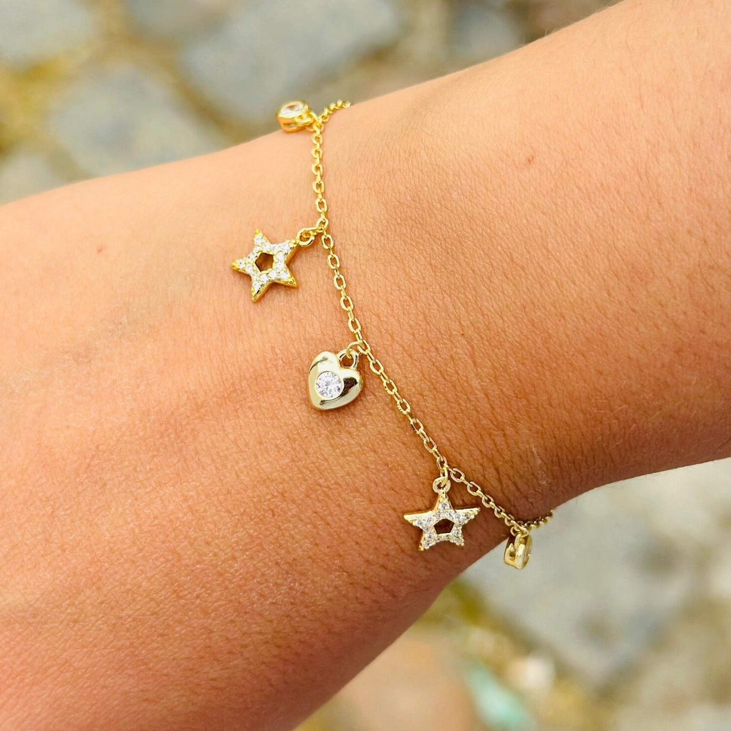 Pulsera de plata chapada en oro con colgantes de estrellas y corazones