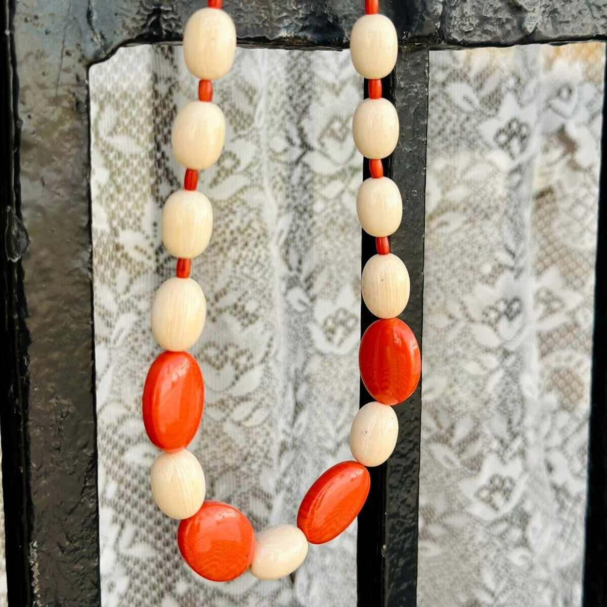 Collar de hueso y coral con distintos tamaños de bolas, cierre de plata
